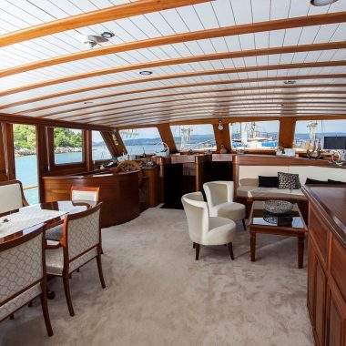 All of her spacious cabins are air-conditioned and equipped to the highest standard with a TV, and a minibar. The saloon is spacious, with comfortable soft sofas and dining area and affords understated tranquillity. There is computer and internet access on the gulet so you can remain connected with the outside world during your holiday, if you chose to do so.