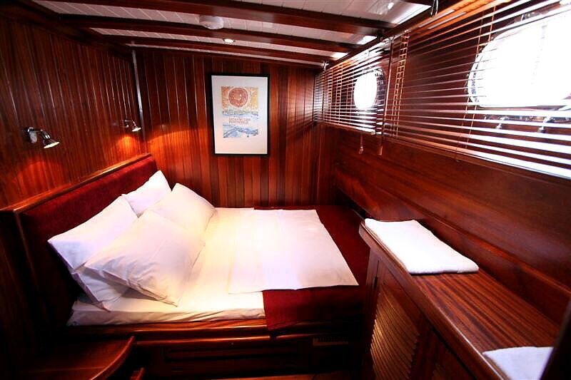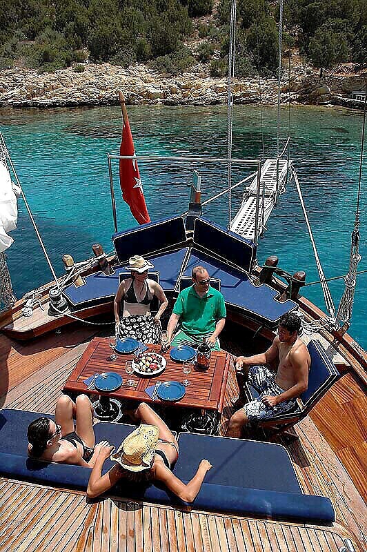 A dedicated living space fort the crew of three, a fully furnished kitchen, indoor and outdoor spaces for eating and relaxing, and a bar are available. An LCD TV, a DVD player and a stereo music player are available in the salon area for the guest’s usage. As expected, there are enough sun bathing mats and chairs in the deck areas to make your yachting voyage a comfortable and the luxurious one as you savour the serenity of the Turkish coastline and the Greek islands.